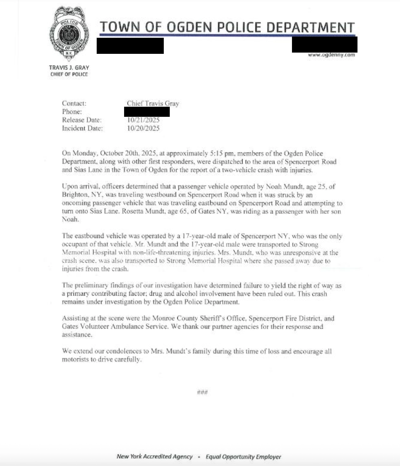 As Noah and Rosetta were returning from dinner, Dylan Cook--a Spencerport High School student--made an illegal left-hand turn and smashed his SUV into Noah's oncoming vehicle. His recklessness caused a major crash at the intersection of Spencerport Road and Sias Lane. Following the initial impact, Noah pulled Rosetta out of the car and administered CPR on the roadside. A nurse who witnessed the accident rushed to assist. Gates EMT was able to locate a strong pulse after arriving on scene 3 to 4 minutes afterward, and Rosetta was rushed to the trauma center at Strong. Because her injuries were so severe, Gates EMT prioritized Rosetta's transport and arranged separate transport for Noah.